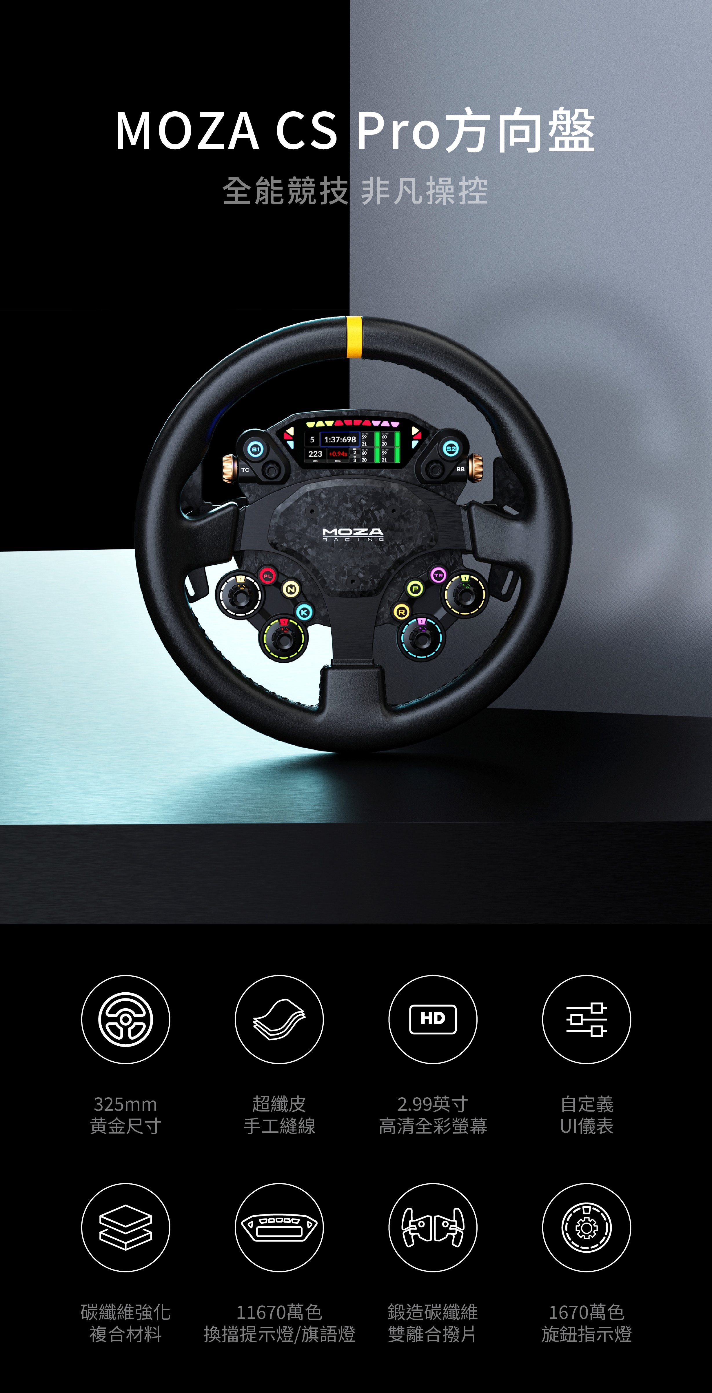 隆重介紹 CS Pro 方向盤-一款功能全面的賽車方向盤。它配備 325 毫米標準輪圈、可自訂的高清顯示器、碳纖維增強結構以及完全可編程的照明和輸入系統,可提供精準的控制、快速的反饋和長時間的舒適性——專為競技比賽和未來的擴展性而打造。