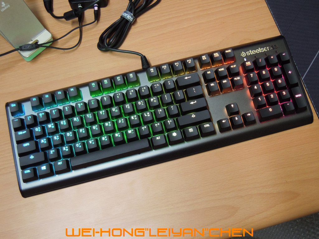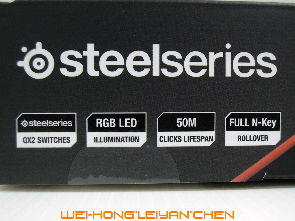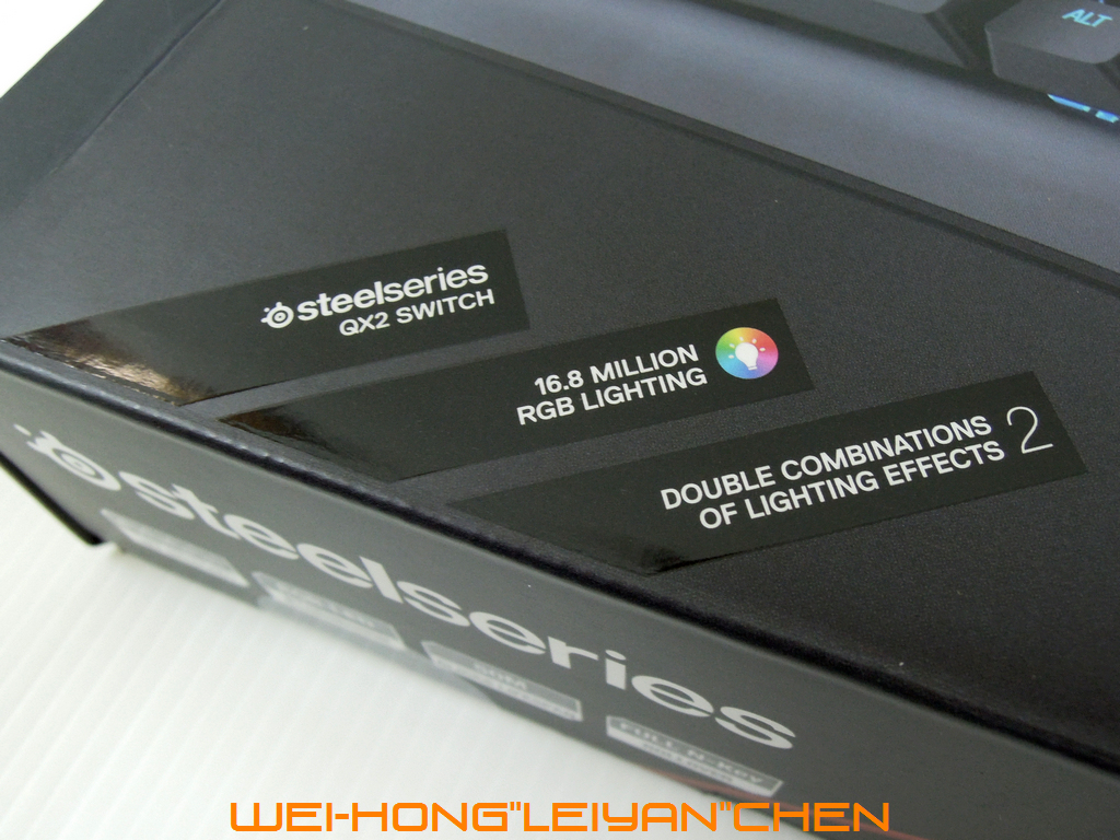 正面左下則是三大特點,採用SteelSeries QX2軸體、1680萬色RGB燈光、雙層燈光效果。