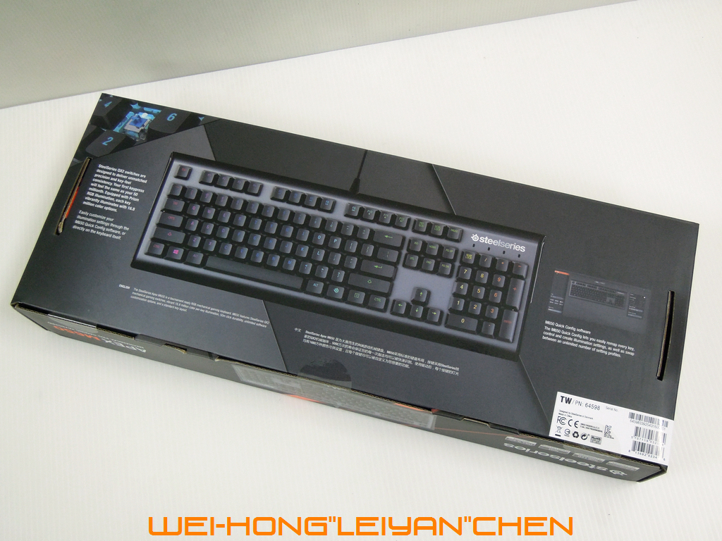 包裝部分採用SteelSeries常見的黑橘配色,正面有APEX M650本體的圖片,但是與實際顏色有落差,包裝上的圖片偏黑,實際的顏色更為好看。