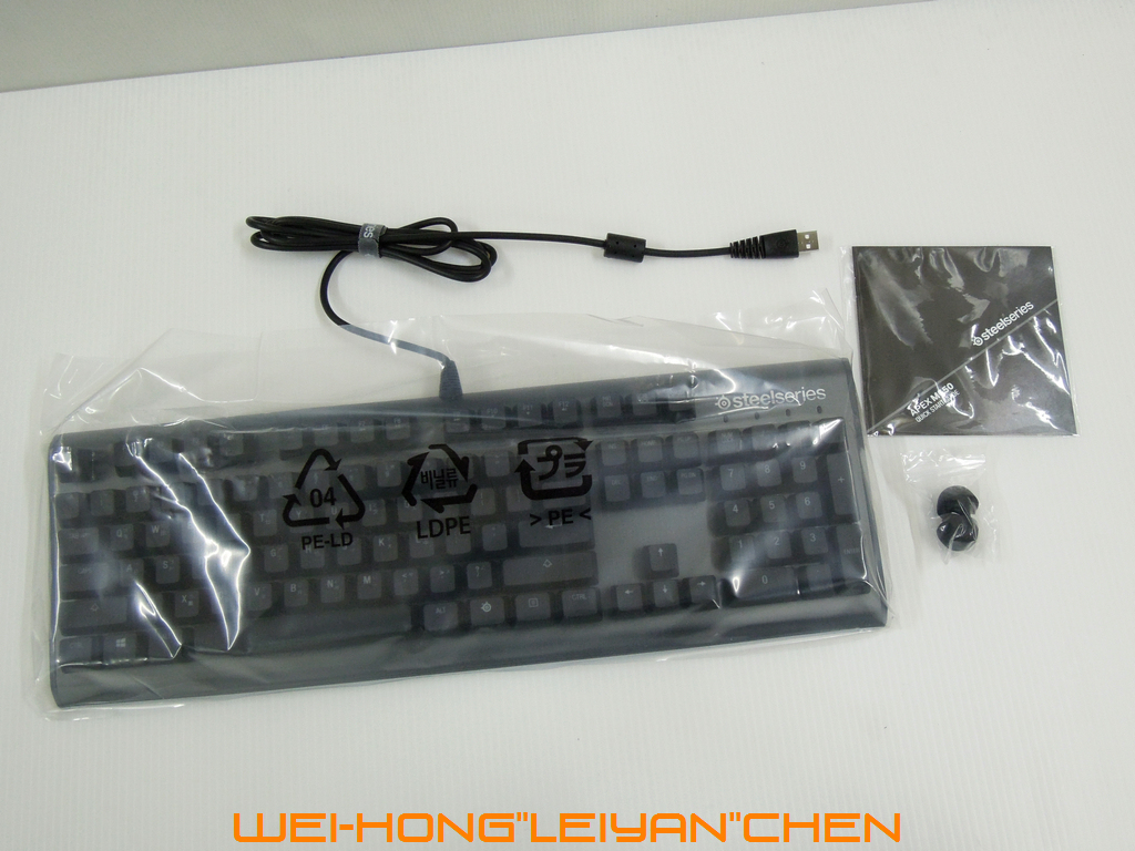 內容物有SteelSeries APEX M650、替換腳墊、說明書;SteelSeries APEX M650有用塑膠袋包覆保護。