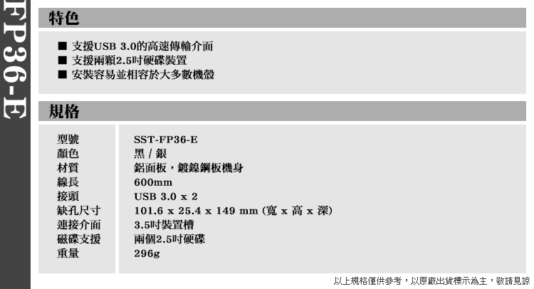 銀欣 SilverStone FP36-E 3.5吋 USB 3.0 擴充槽 黑 銀 可安裝2.5吋硬碟x2