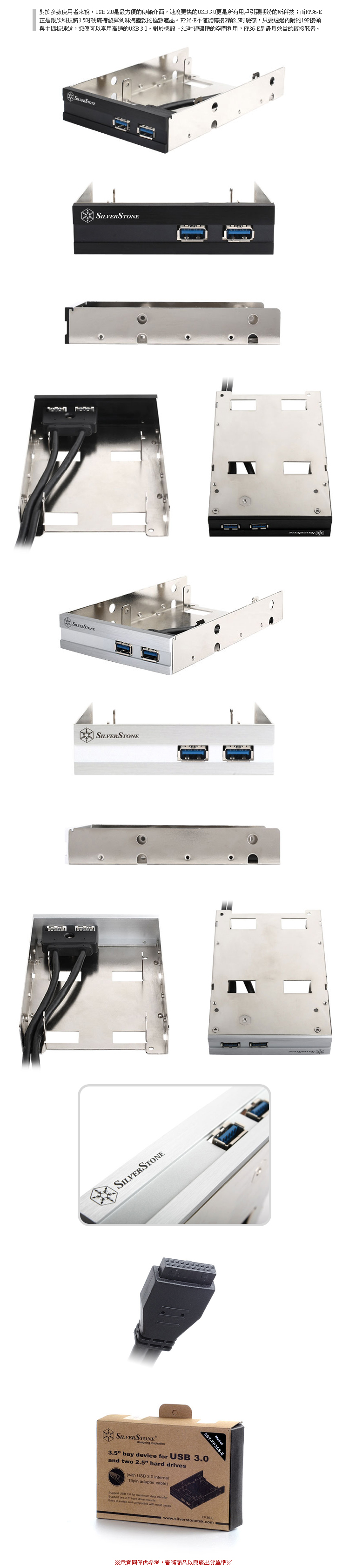 對於多數使用者來說,USB 2.0是最方便的傳輸介面,速度更快的USB 3.0更是所有用戶引頸期盼的新科技;而FP36-E正是銀欣科技將3.5吋硬碟槽發揮到淋漓盡致的極致產品。FP36-E不僅能轉接2顆2.5吋硬碟,只要透過內附的19P接頭與主機板連結,您便可以享用高速的USB 3.0。對於機殼上3.5吋硬碟槽的空間利用,FP36-E是最具效益的轉接裝置。