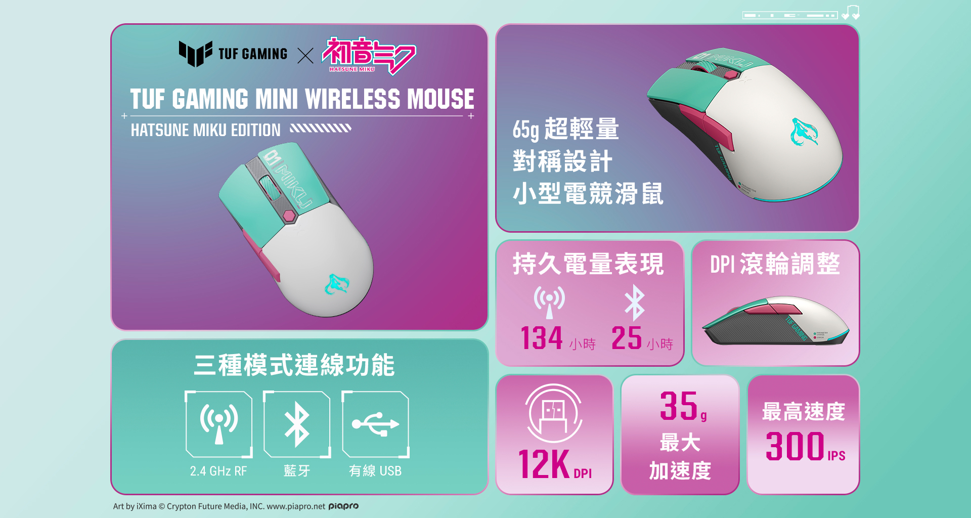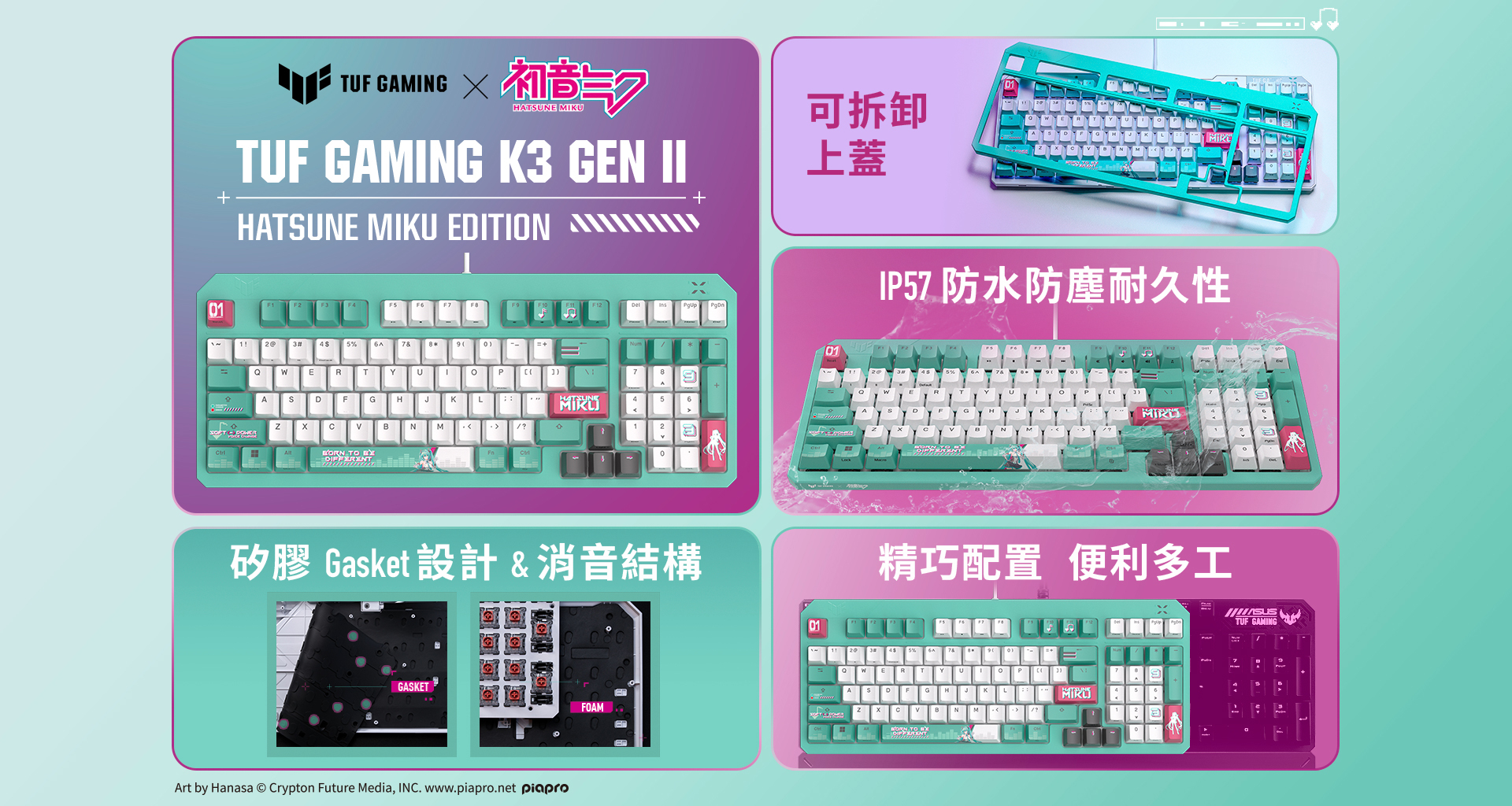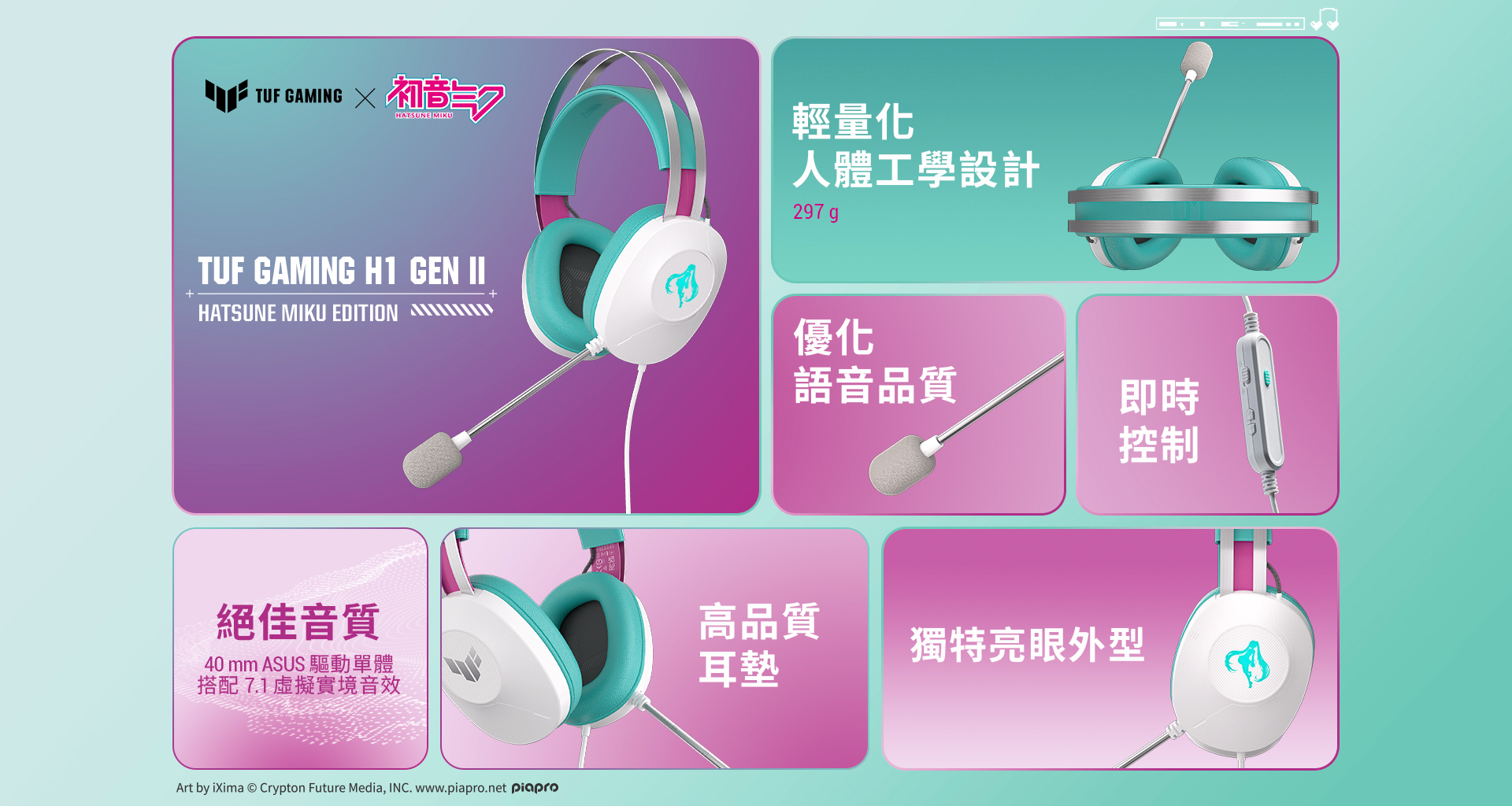 ASUS 與 Crypton Future Media 攜手合作,推出 TUF Gaming x 初音未來 聯名系列,為遊戲世界注入賽博風格的嶄新能量。首波產品陣容包括耳機、鍵盤、滑鼠與滑鼠墊,融合 TUF Gaming 的機械裝甲美學與初音標誌性的青綠與粉紅配色。這款特別版系列結合了 TUF 經典設計與初音活潑俏皮的精神,讓玩家與粉絲能夠打造充滿未來感的遊戲周邊配置。