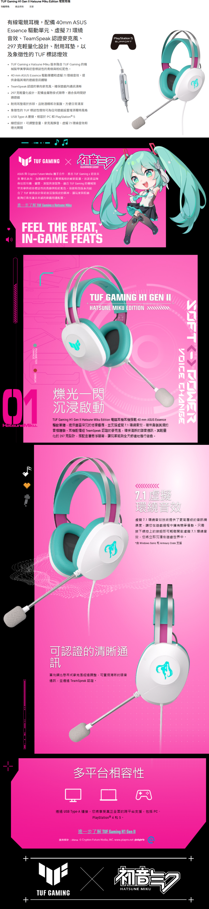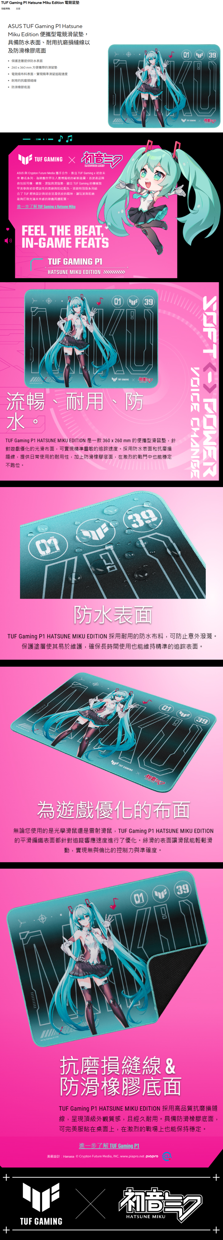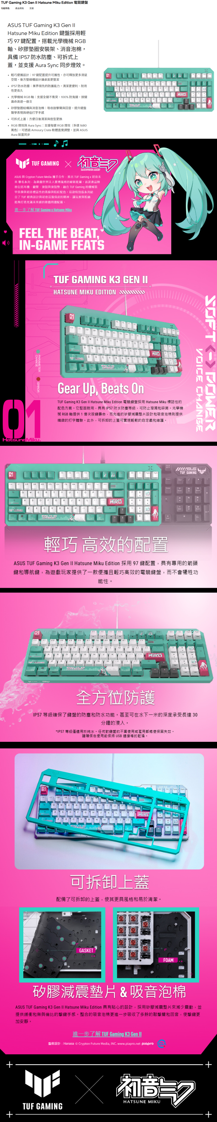ASUS 與 Crypton Future Media 攜手合作,推出 TUF Gaming x 初音未來 聯名系列,為遊戲世界注入賽博風格的嶄新能量。首波產品陣容包括耳機、鍵盤、滑鼠與滑鼠墊,融合 TUF Gaming 的機械裝甲美學與初音標誌性的青綠與粉紅配色。這款特別版系列結合了 TUF 經典設計與初音活潑俏皮的精神,讓玩家與粉絲能夠打造充滿未來感的遊戲周邊配置。