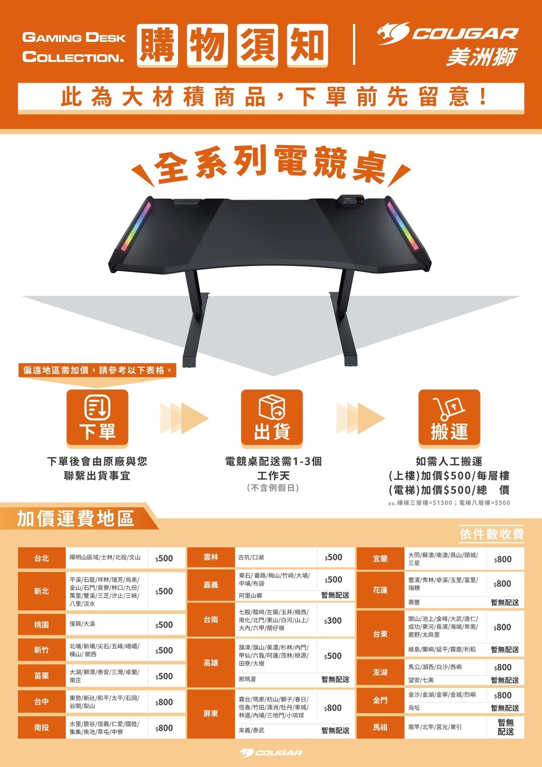 ⚠️大型物件(電競桌椅沙發)如迫切需求在週六送達,需要額外加價服務費250元。