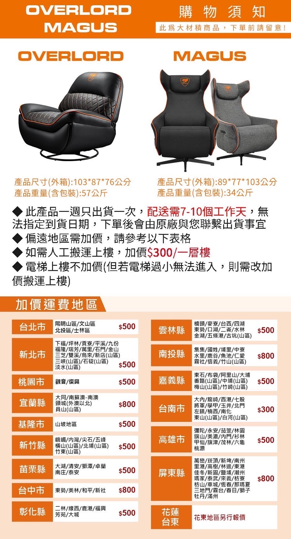 | 型號 | COUGAR MAGUS 魔導士零重力電動椅 |