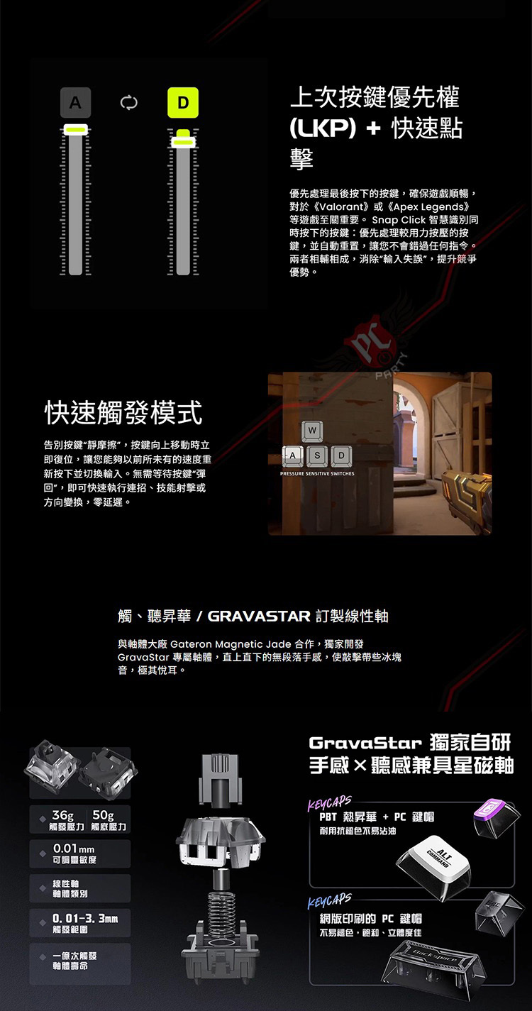 • 磁軸設計|GravaStar x Gateron 打造,可在 0.005mm~3.3mm 之間以 0.005 mm 精度自訂觸發點
