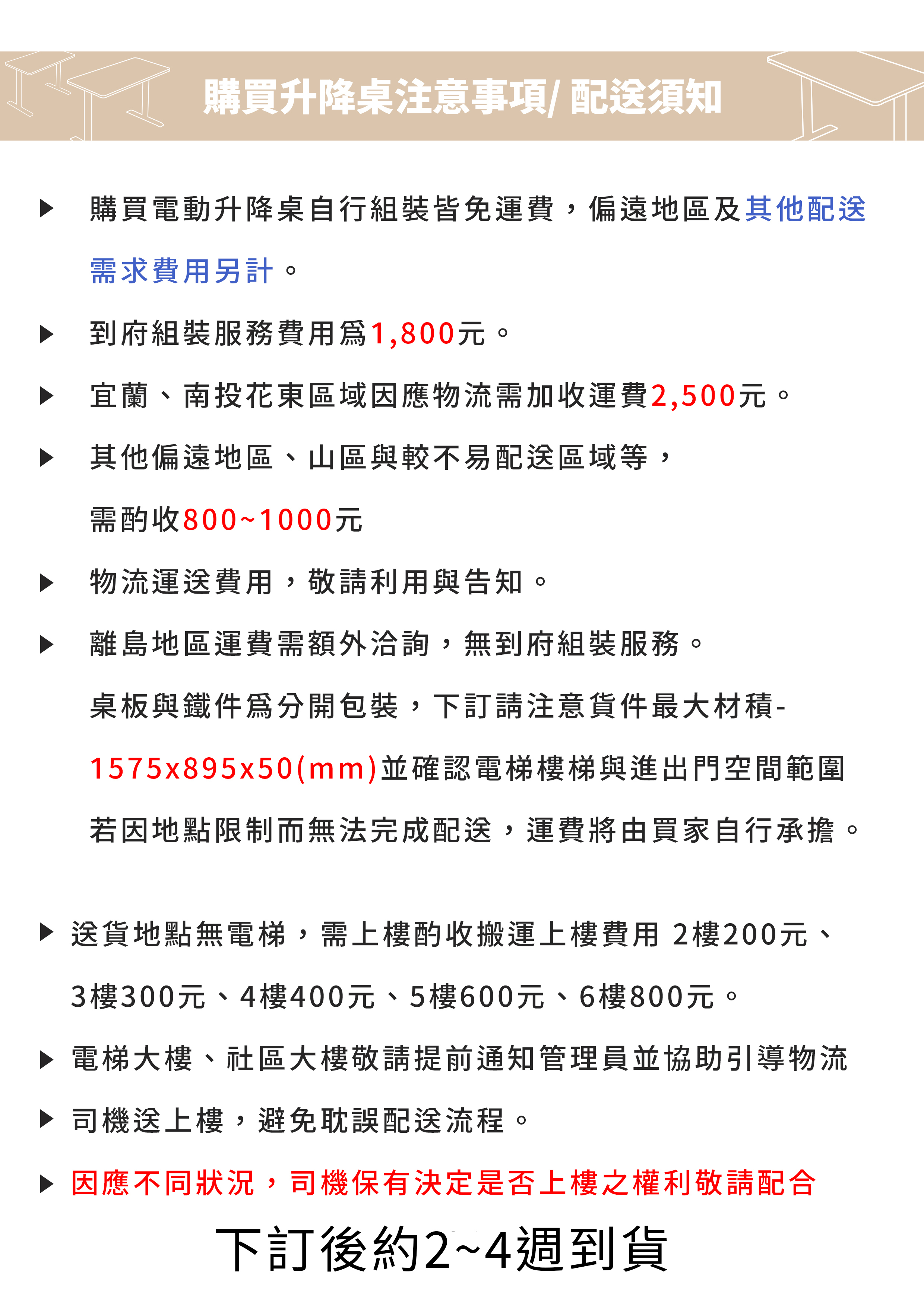 ※購買電動升降桌自行組裝皆免運費,偏遠地區及其他配送需求費用另計。