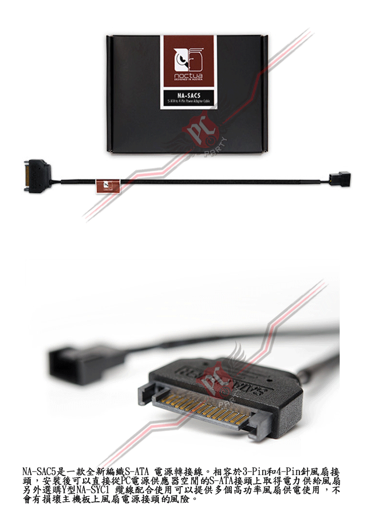 包裝內容物:1x NA-AC5 (S-ATA接頭轉 4-pin 風扇電源接頭纜線)