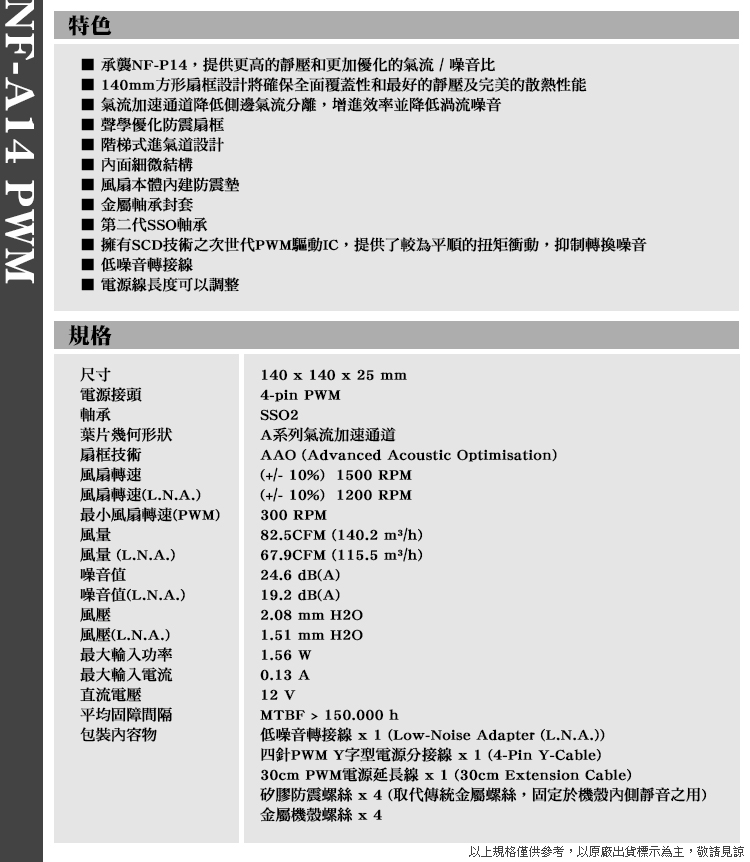 •承襲NF-P14,提供更高的靜壓和更加優化的氣流/噪音比